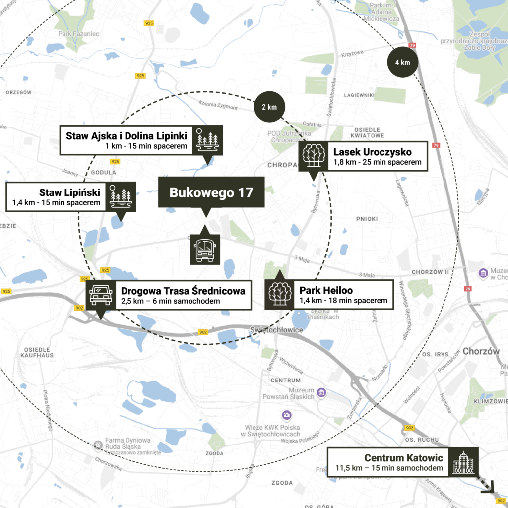 Bukowego 17 w Świętochłowicach to inwestycja, która oferuje znakomitą lokalizację w sercu Górnego Śląska. Bliskość do centrum Katowic, Chorzowa czy Bytomia zapewnia komfortową komunikację z najważniejszymi ośrodkami miejskimi regionu. Bezpośredni dostęp do Drogowej Trasy Średnicowej umożliwia swobodne podróżowanie po całym regionie, co stanowi znaczące udogodnienie dla mieszkańców.Rozwiń ∨