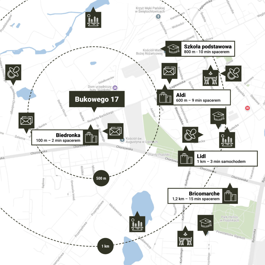 Bukowego 17 to idealne miejsce dla osób ceniących sobie wygodę miejskiego życia. W sąsiedztwie znajdują się popularne markety, takie jak ALDI, Lidl czy Biedronka, dzięki czemu szybko można zrobić niezbędne zakupy. Bliskość paczkomatów, punktów usługowych, przystanku tramwajowego oraz apteki to dodatkowe atuty lokalizacji, które na co dzień pozwalają zaoszczędzić czas. Niedaleko znajdują się także udogodnienia dla rodzin z dziećmi – przedszkola, szkoły i place zabaw.