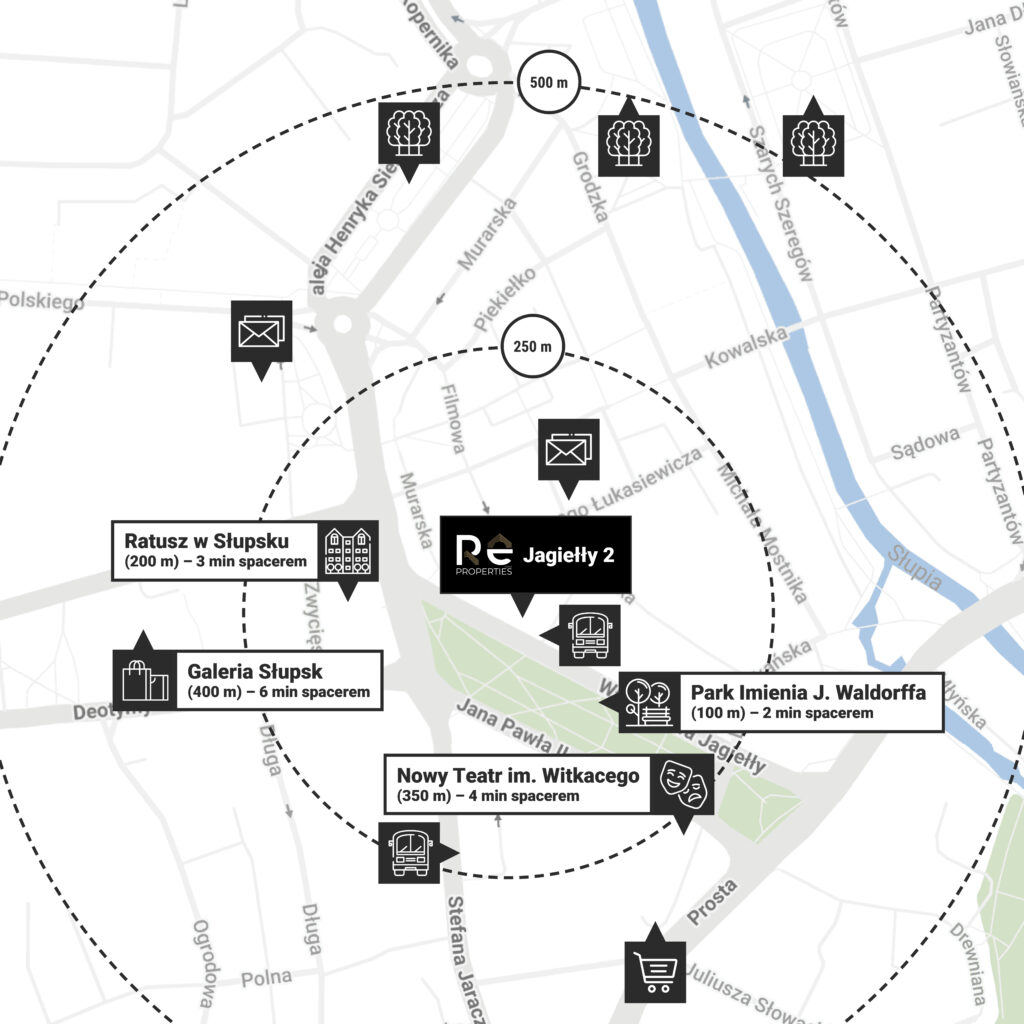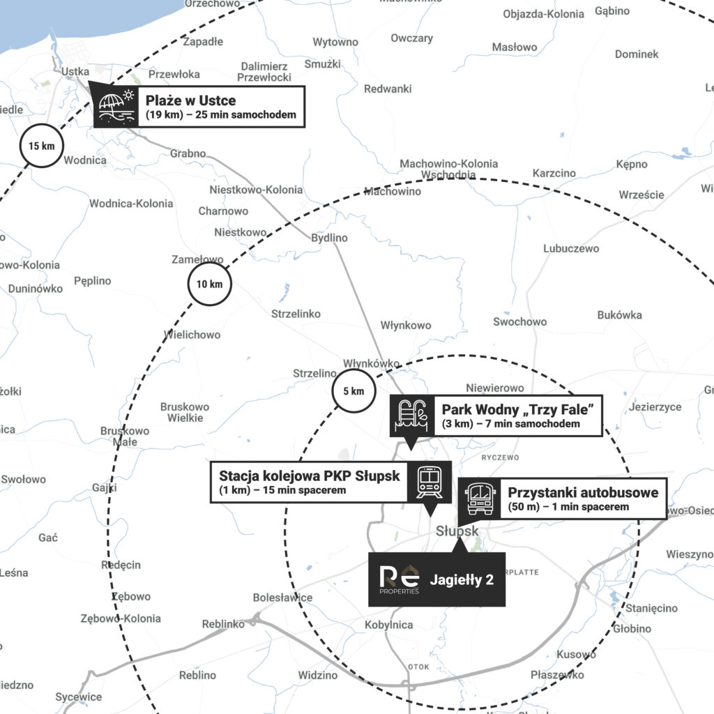 Jagiełly 2 jest zlokalizowana w centrum Słupka u zbiegu 4 ulic: Jagiełły, Łukasiewicza, Teatralnej i Mikołajskiej. To doskonale skomunikowana okolica – blisko wjazdu na drogę krajową nr 21, przystanków autobusowych oraz zaledwie 15 minut spacerem od stacji PKP.Rozwiń ∨