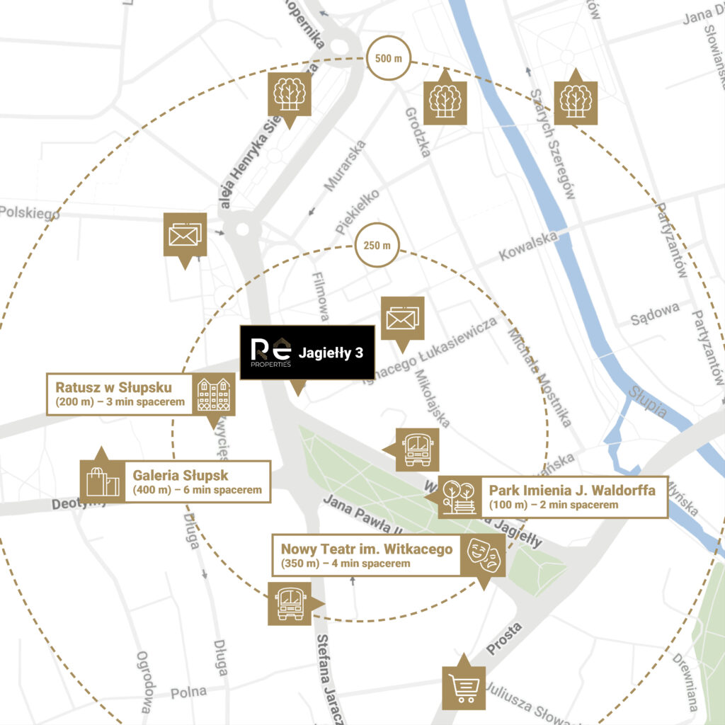 Tutaj wszystko masz na wyciągnięcie ręki – od sklepów i galerii handlowych, przez szkoły, urzędy i placówki medyczne, aż po klimatyczne kawiarnie, restauracje czy miejskie parki. Z okien Jagiełły 3 rozpościera się widok na piękny Ratusz, Złotą Kamienicę oraz Park im. Jerzego Waldorffa, a kilka kroków dzieli Cię od kin i teatrów. W okolicy znajdziesz również zabytki, miejsca spotkań oraz kultowe punkty na mapie miasta, które tworzą wyjątkową atmosferę tego miejsca. To przestrzeń, która inspiruje do tego, by w pełni korzystać z bogatej oferty Słupska.